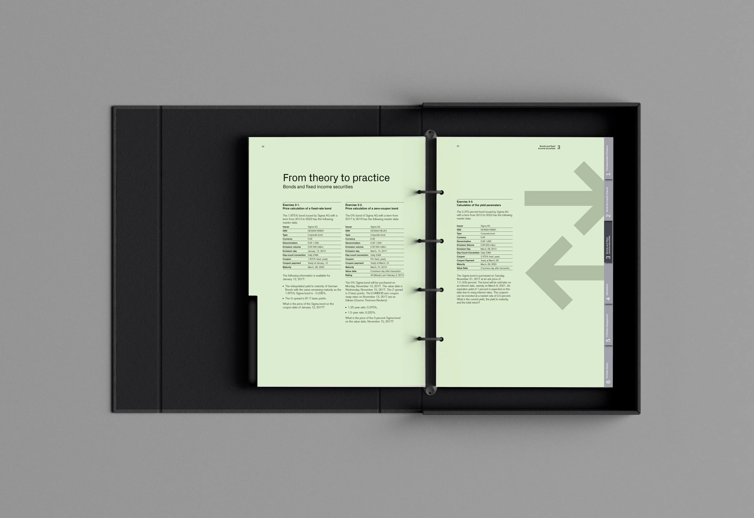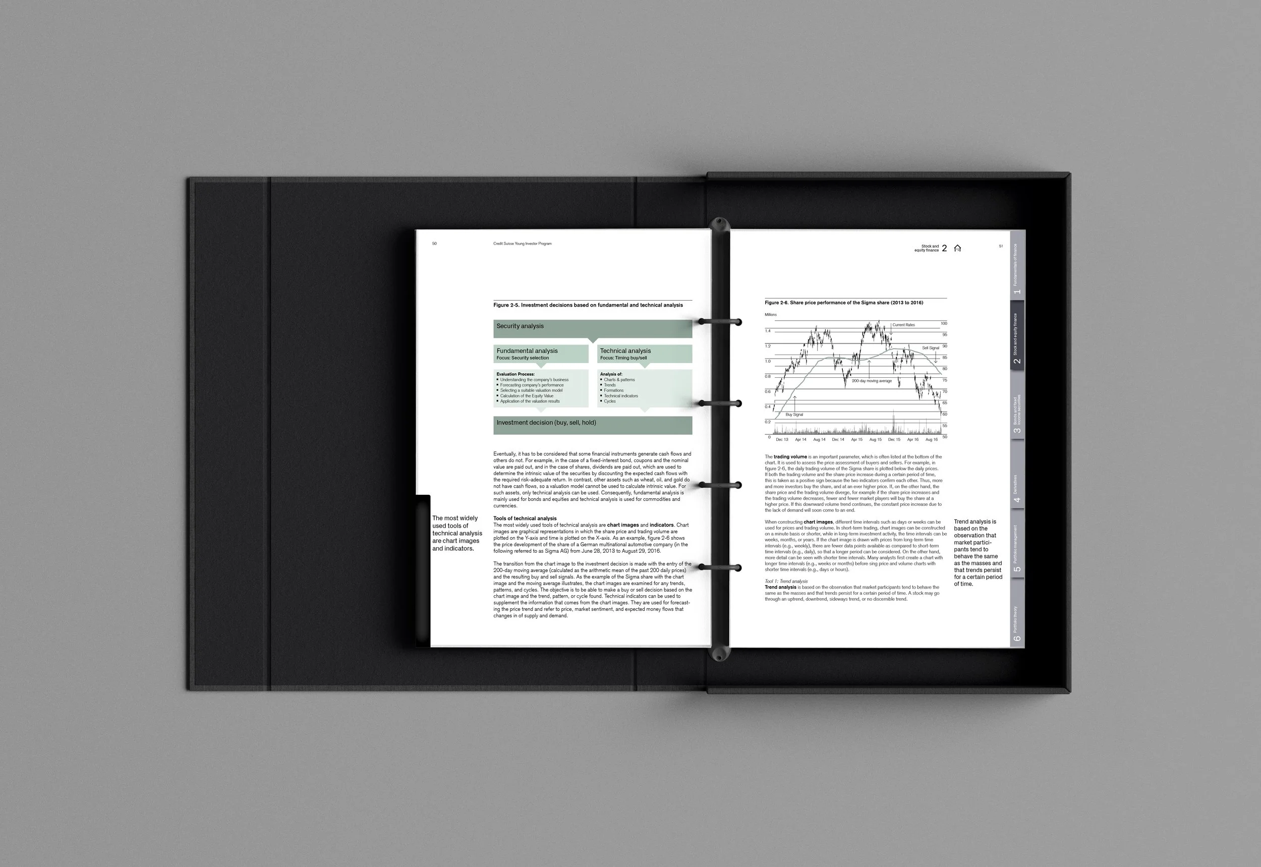 Studio Blyss designed a sound teaching aid for the Credit Suisse Young Investors Program that not only conveys complex content, but also functions as a workbook. With punched indexes, flexible binding and a visual system that also provides an overview of mathematical formulas.