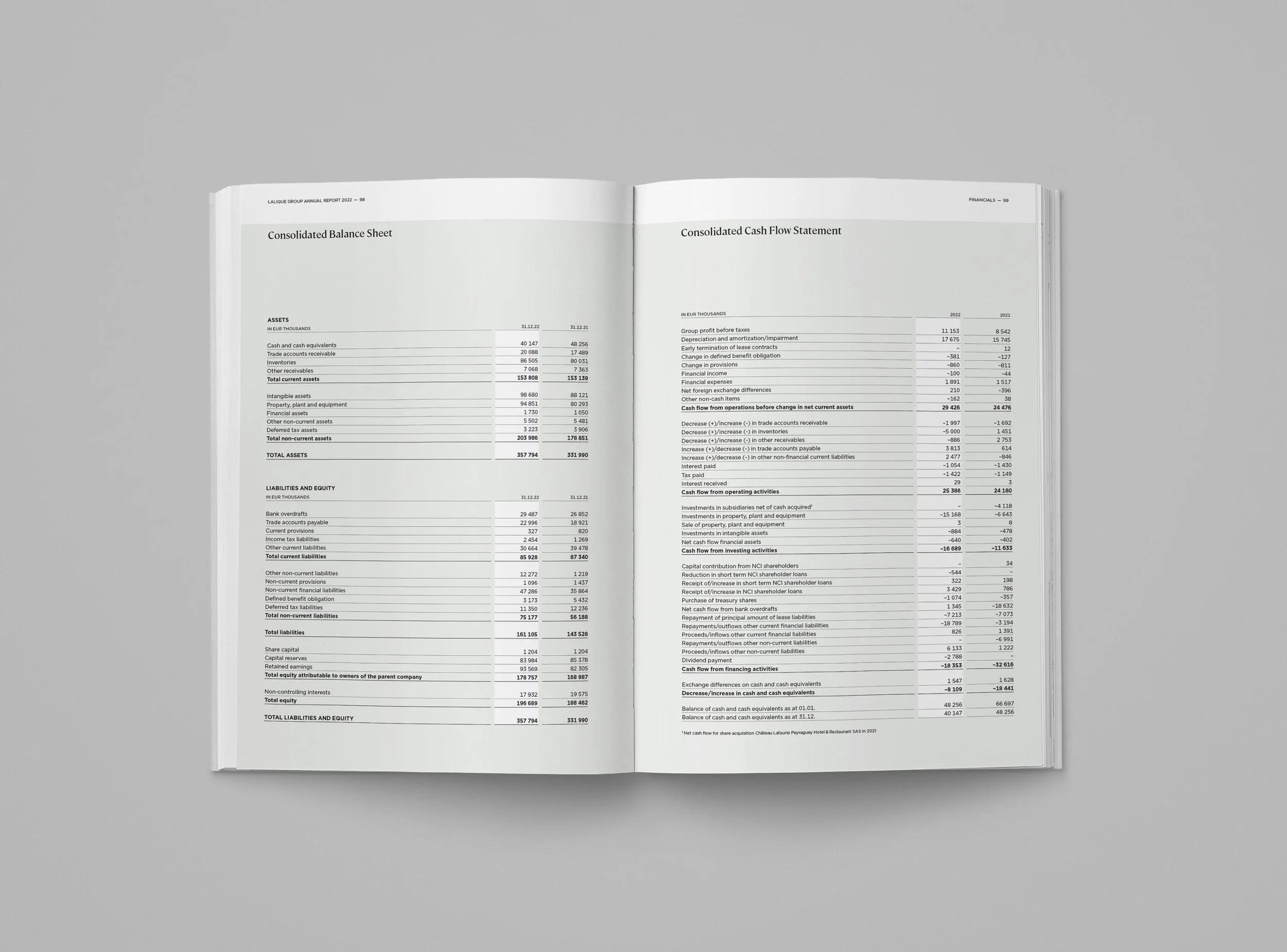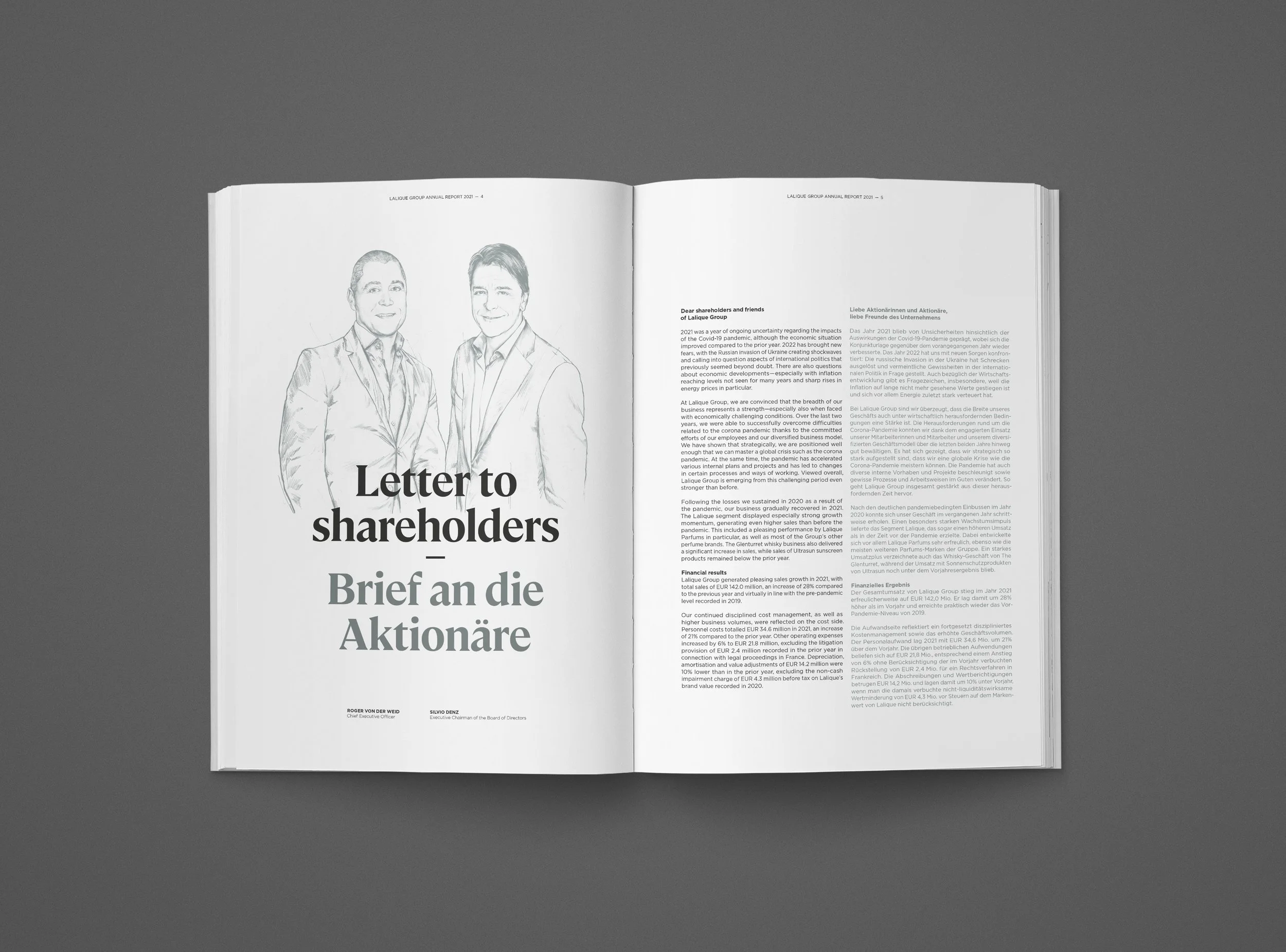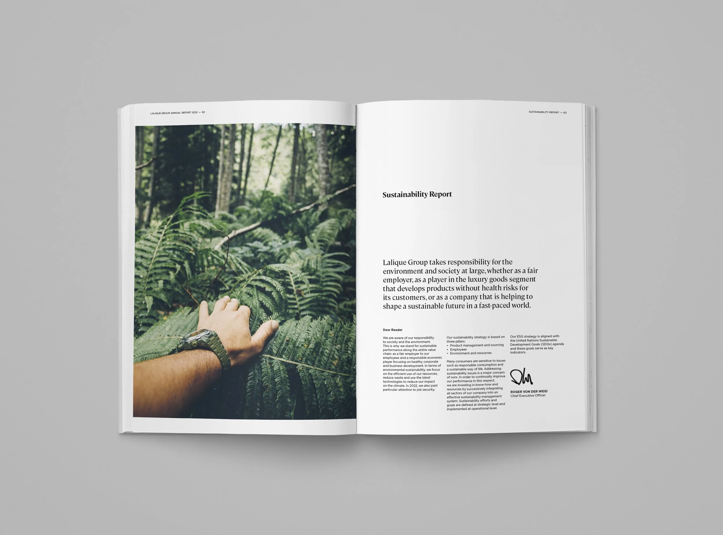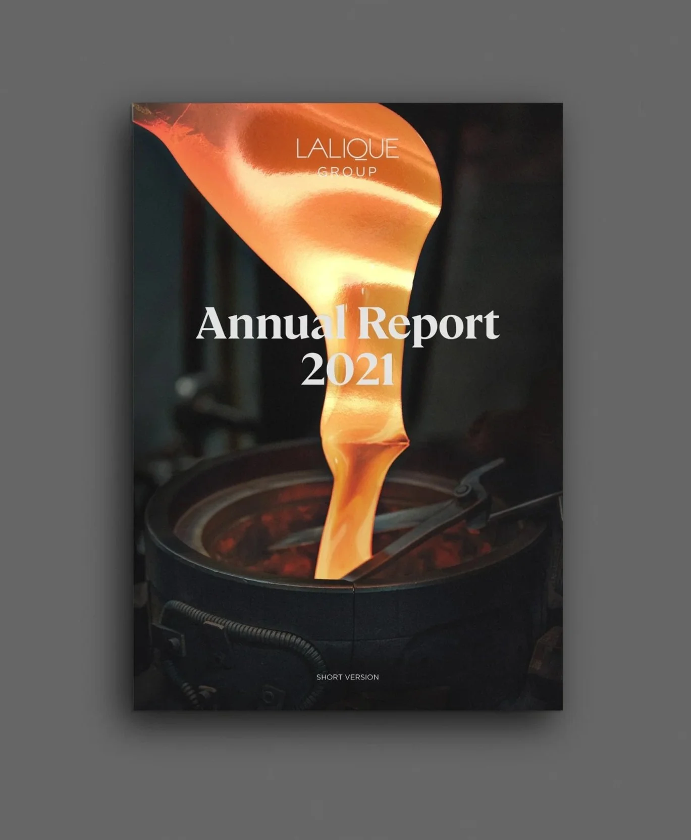 The project was discontinued after the 2024 issue – as part of the Lalique Group's withdrawal from the Swiss stock exchange. The report was one of many projects that we were able to realize for the Group. The collaboration continues: We are currently supporting Lalique Hospitality and all hotel and catering establishments in strategic development and visual conception. Other brands of the Group are also being created with us – as an ongoing dialogue between design, identity and impact.