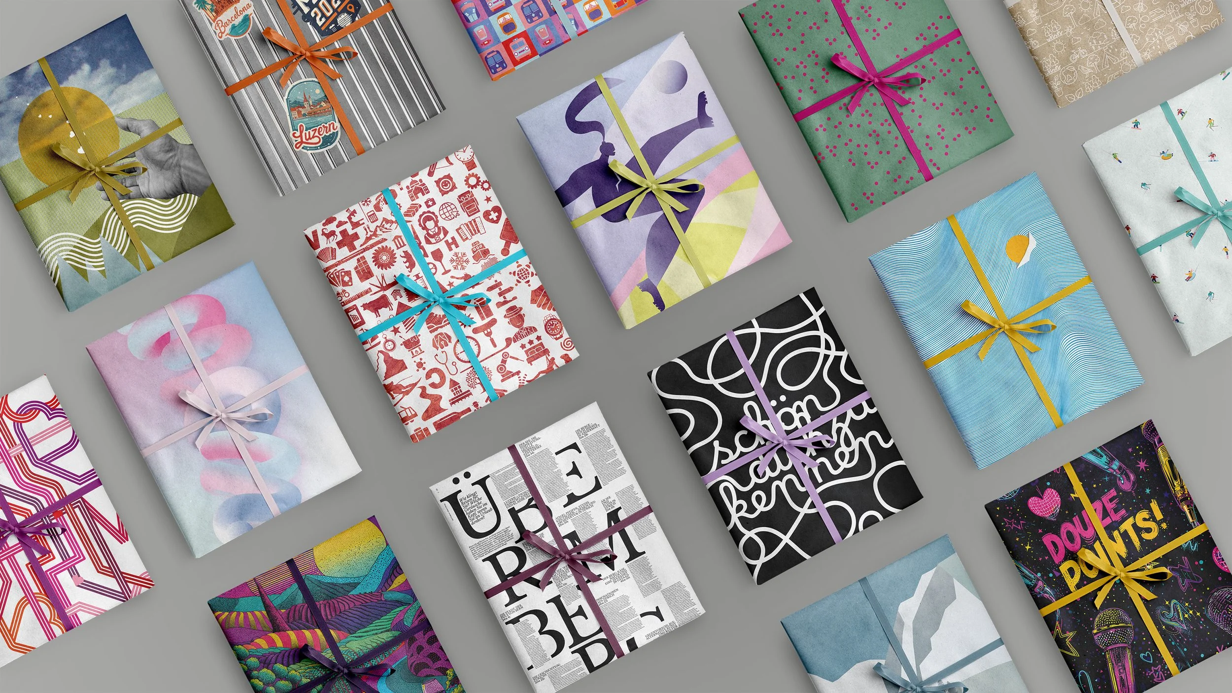 Studio Blyss developed the wrapping paper magazine as a hybrid publication in which each double-page spread serves as both wrapping paper and a themed shop window. The 16 different patterns each reflect a key moment or area of activity of the 16 employees of the Switzerland Tourism Germany office.