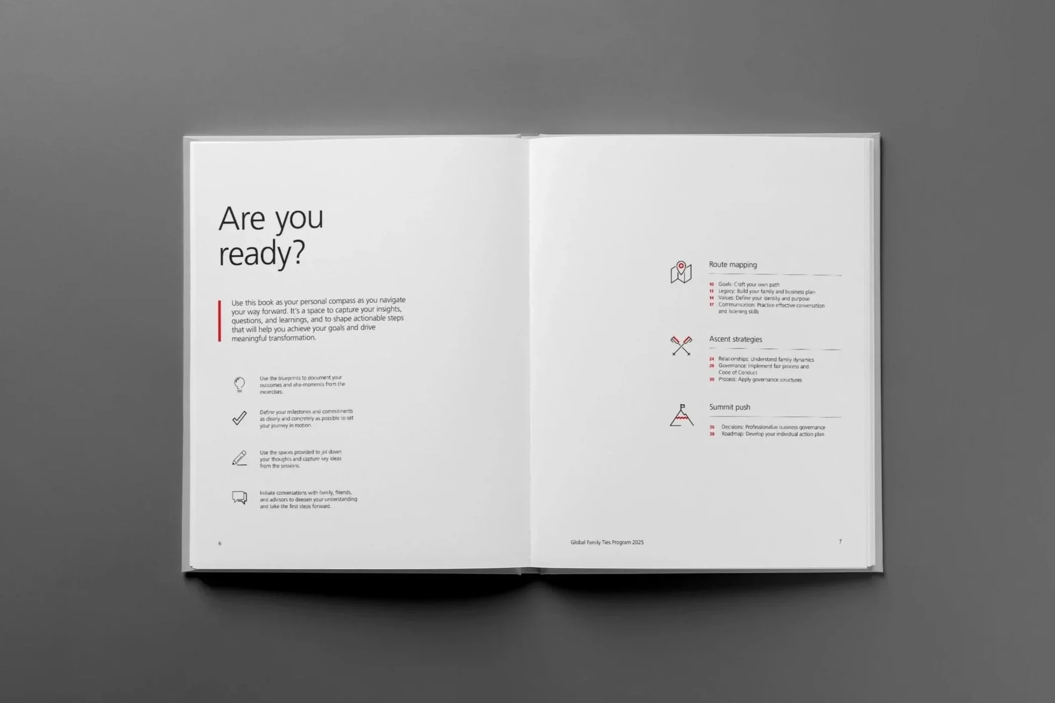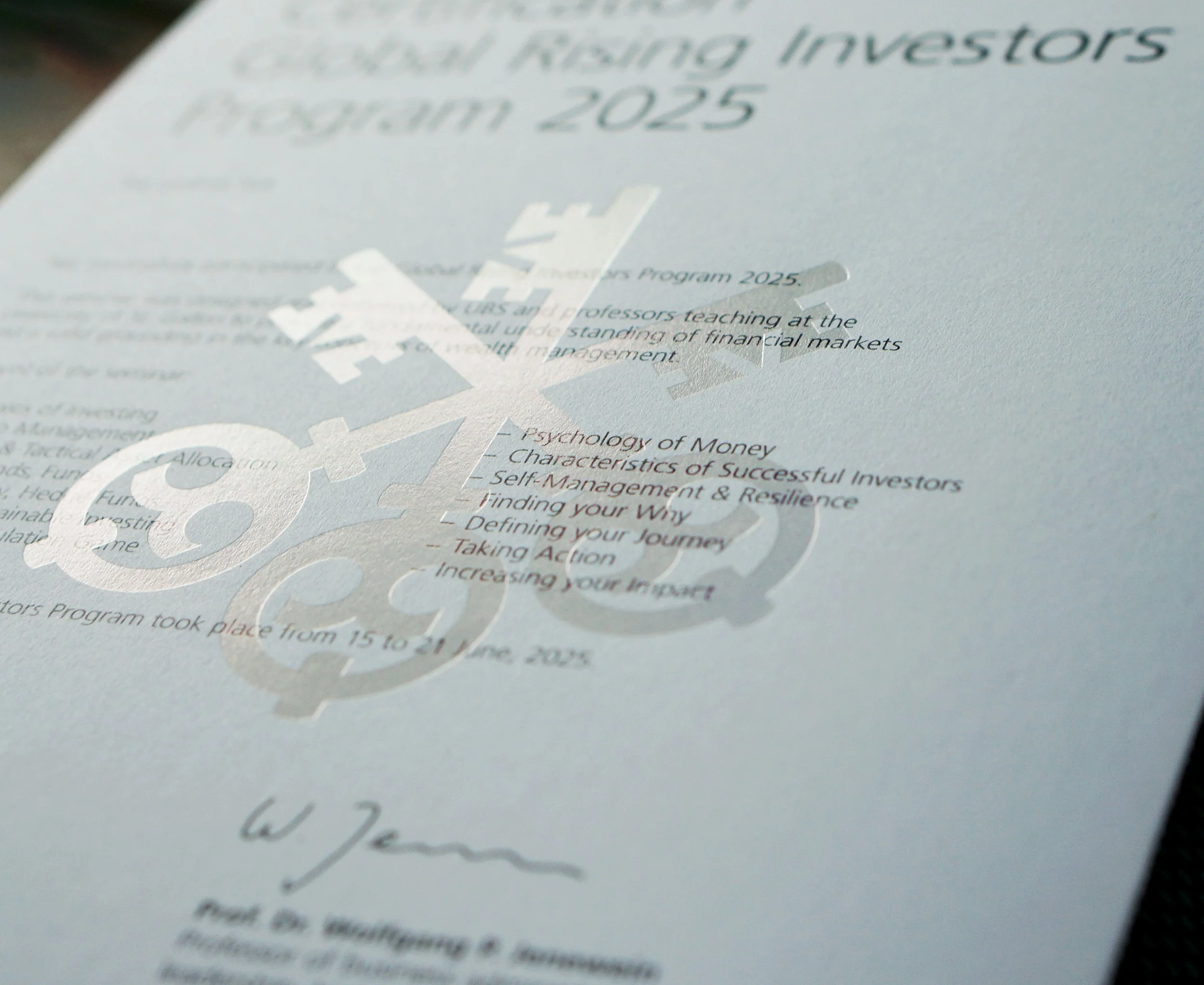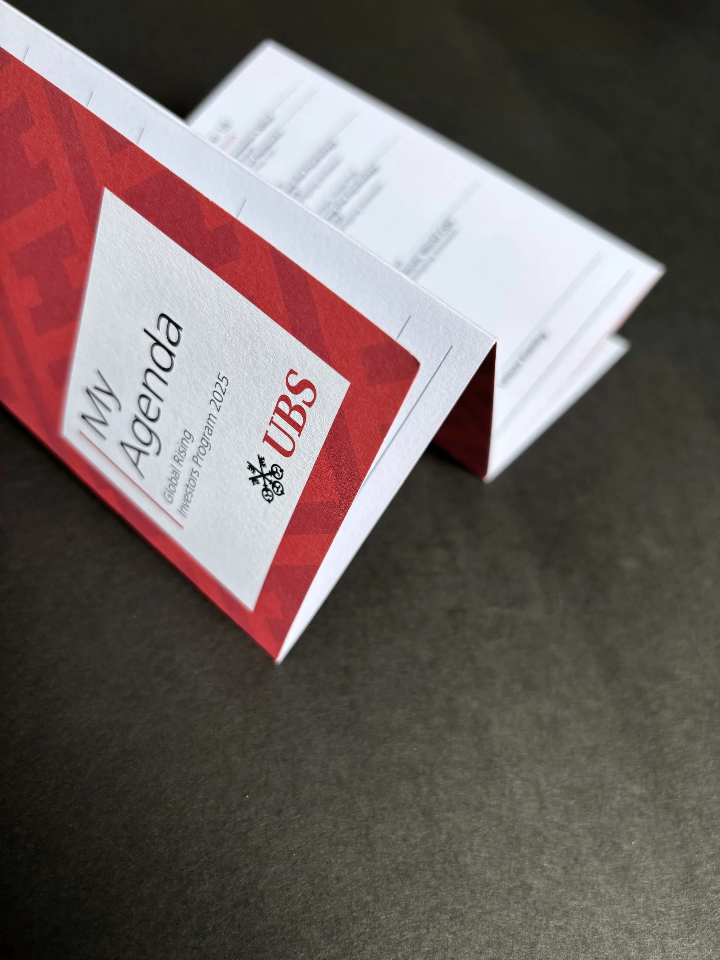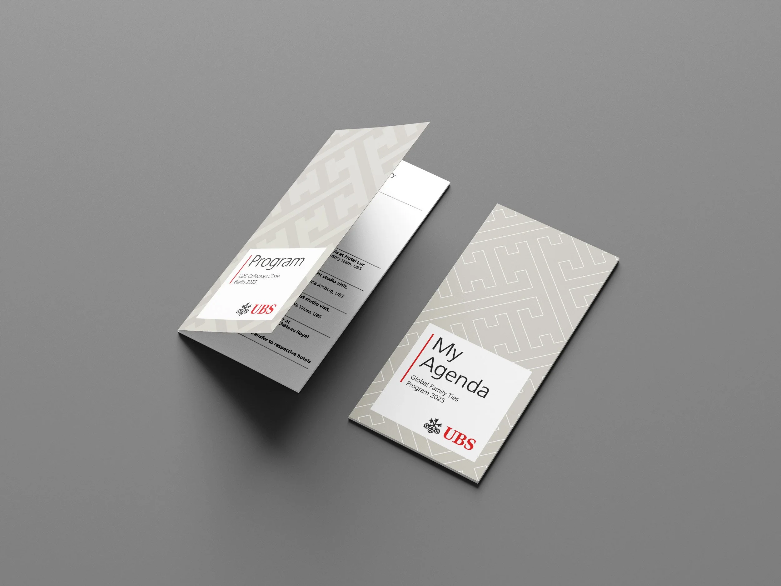 Making excellence visible - through every single detail. The events bring together young members of ultra-high-net-worth families from all over the world. The demands on the design are correspondingly high: it must be internationally compatible, reflect the prestige of UBS and at the same time speak an open, modern language. Not as an event decoration, but as a strategically staged overall picture - from the welcome card to the certified booklet.