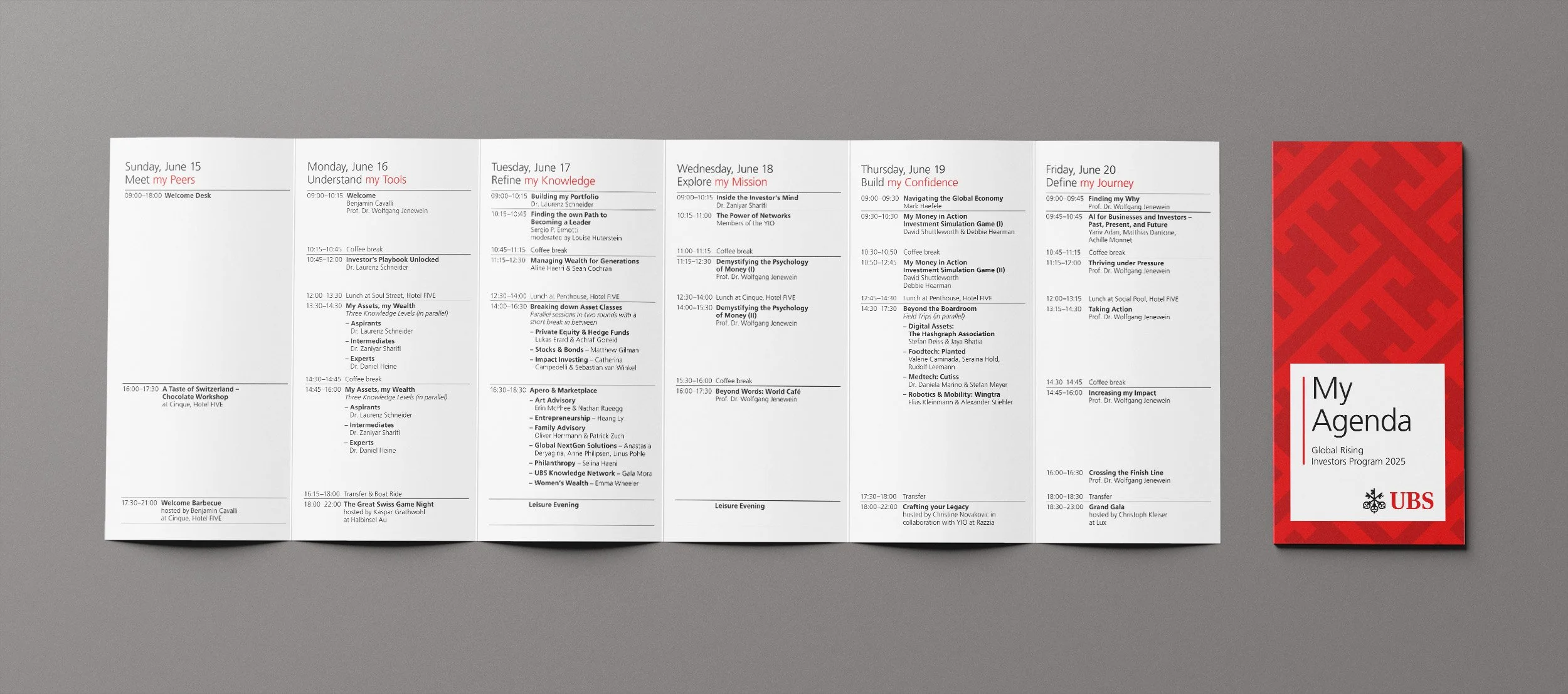 NextGen experiences that last - analog and international. The programs show how much trust is created through a consistently thought-out brand experience. For a target group that otherwise often only meets digitally, the printed materials are a welcome exception - a tactile experience that provides orientation, makes content tangible and subtly anchors the UBS brand. The consistent recognizability over the years creates familiarity - and strengthens UBS's positioning as a leading global partner for the next generation.